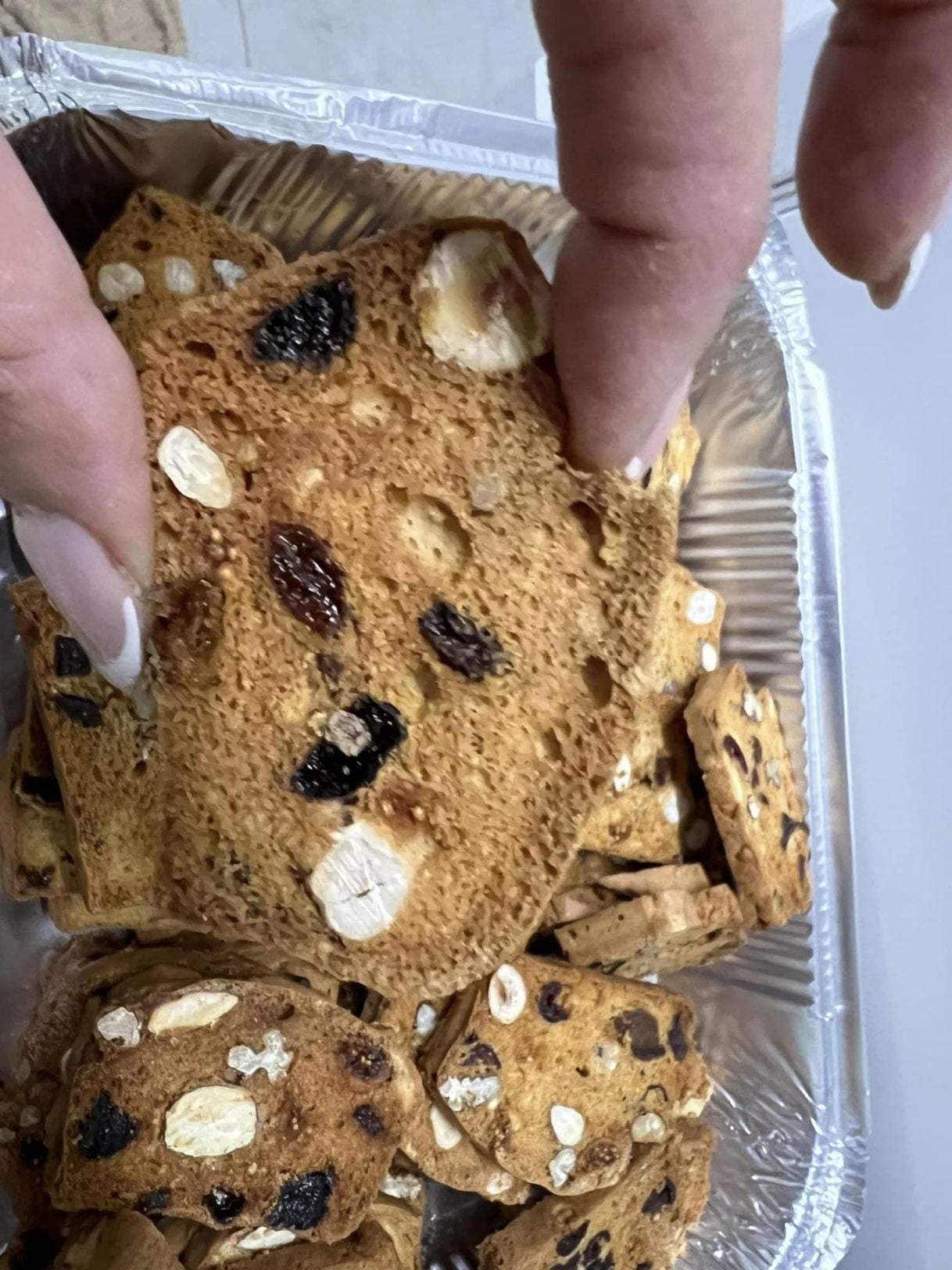 לאפות על 180 מעלות כ40 דקות לצנן לכסות בנילון ולהקפיא. יום למחרת לפרוס פרוסות בעודן קפואות ולסדר בתבנית ,