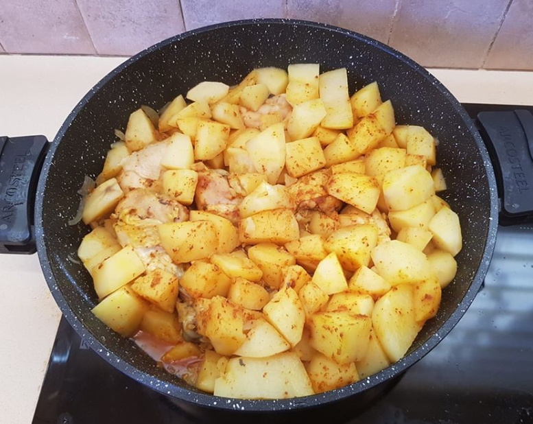 * להוסיף הכל לסיר עם העוף ולהוסיף כוס אחת מים.