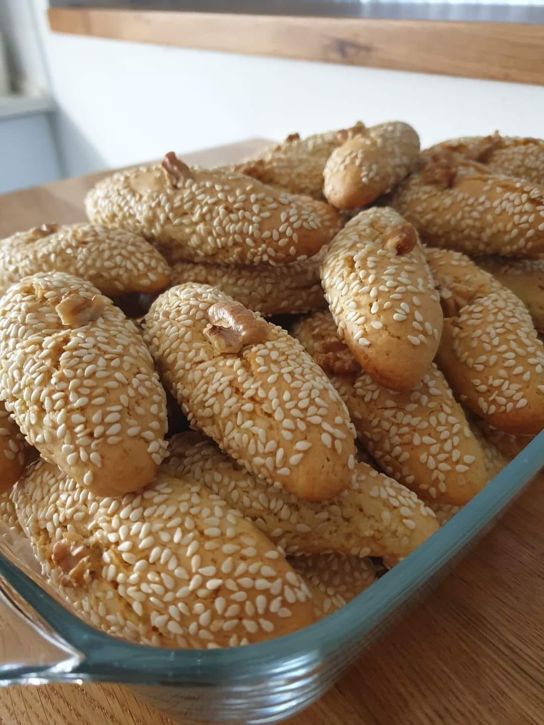 1. ביצים כוס שמן כוס סוכר.. חופן של אניס שלם ולכתוש אותו מעט ..100 גרם צימוקיםכוס אגוזים קצוצים חופן שומשום.
