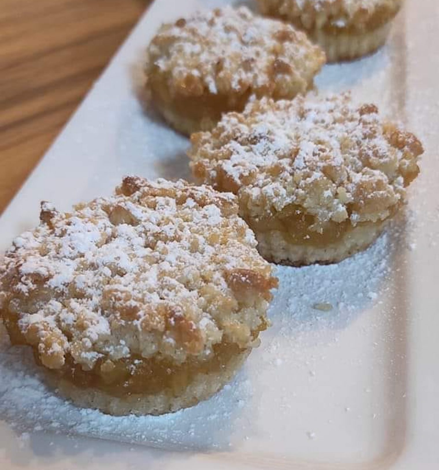 * ניתן להכין בתבניות אישיות של מאפינס .לפזר כף פירורים להדק למרוח מחית תפוחים ומעל לפזר מהפירורים