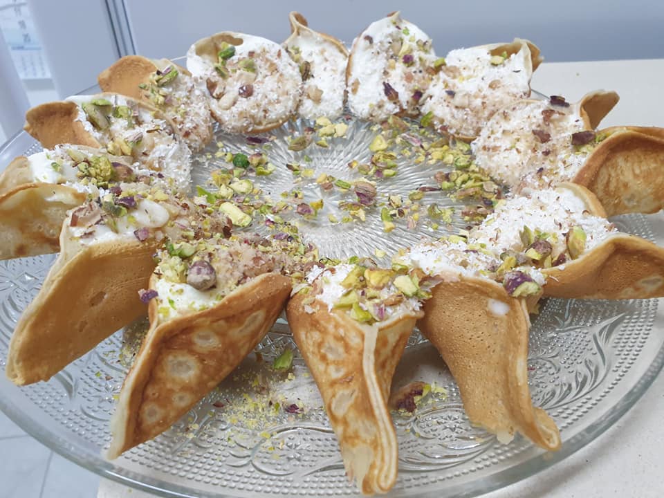 3 טיפות מי ורדים .לשמן עם מעט חמאה רק בפעם הראשונה ליצור עיגולים קטנים ולהפוך רק לאחר שהם כמט מוכנים ..למספר שניות .לצנן למלא במילוי ולהדק לחצי …ולמלא בקרם. ניתן למלא בשמנת מתוקה ,אינסטנט וניל וחצי כוס חלב .
